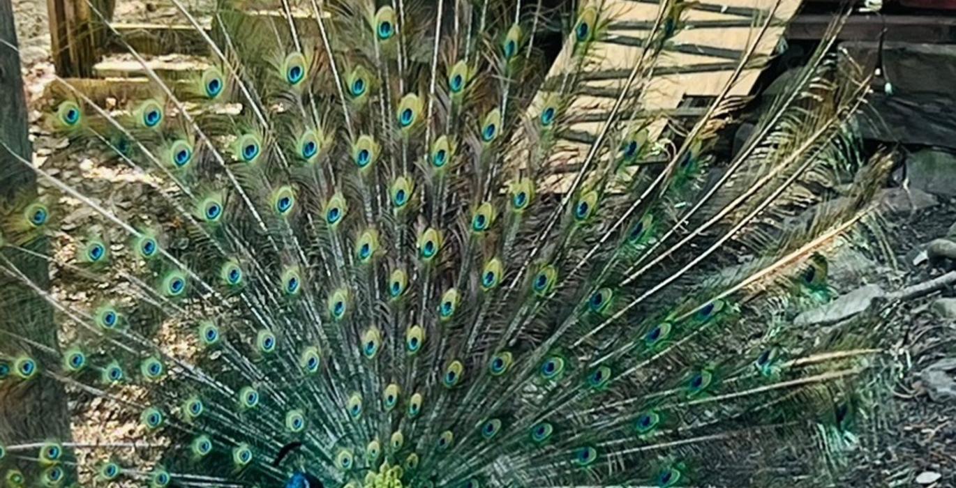 Riikinkukko Cesar ja riikinkana Phoenix. Nämä eksoottiset lintuset ovat meidän muiden ”isojen tyttöjen” kanssa. Etenkin keväällä voi kuulua viidakkomaisia ääniä, kun päästelevät NJAUU ja TRÖÖT- äännähdyksiä. Kevään aikana Cesar kasvattaa jälleen uuden laahuksen, jolla liehittelee Phoenixia.