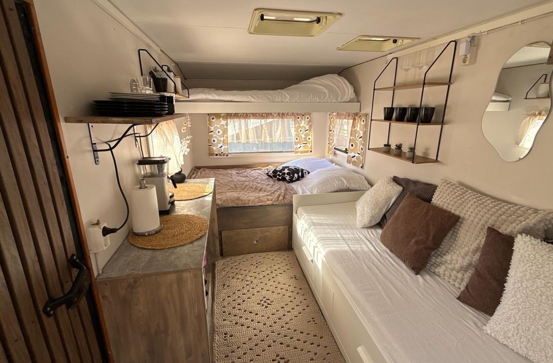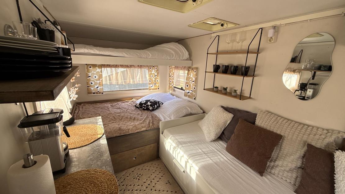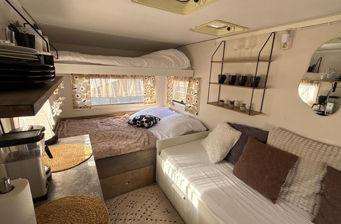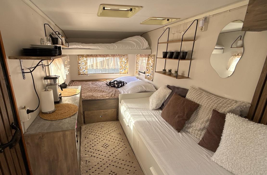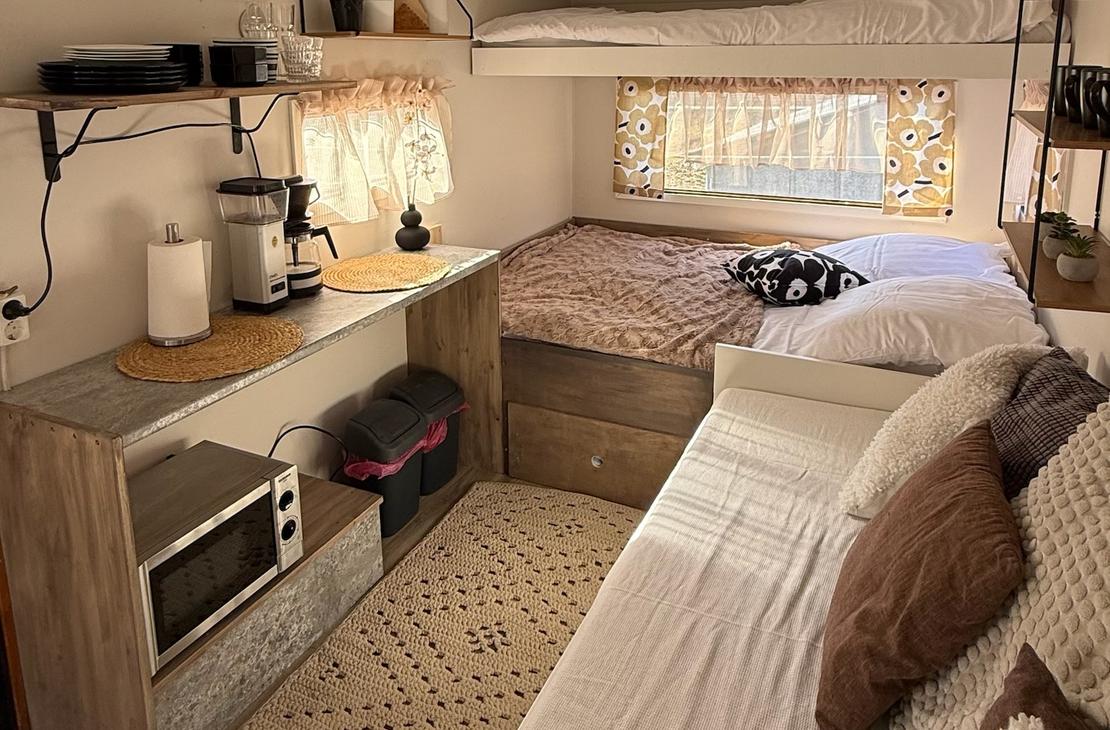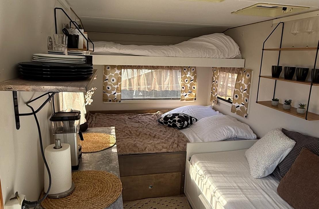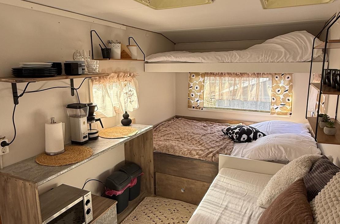 Kotivaunusta löytyy sänkypaikat 4:lle henkilölle, joista yksi sänkypaikka on yläsänky ja sen painoraja on 70kg:a. Kotivaunussa on astioita, mikro, kahvinkeitin sekä pieni jääkaappi.