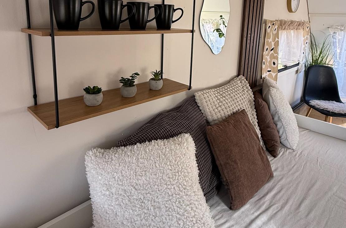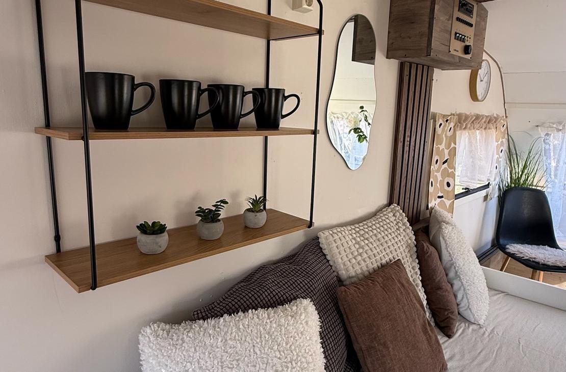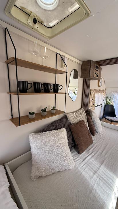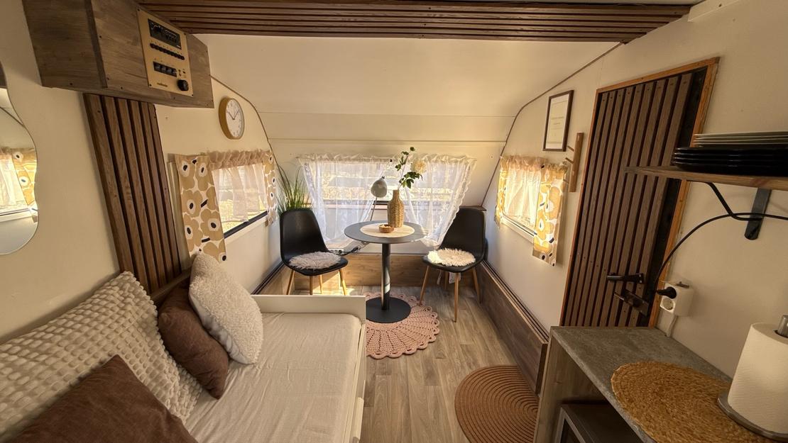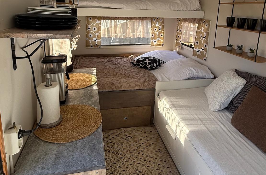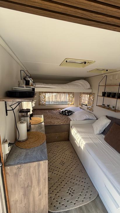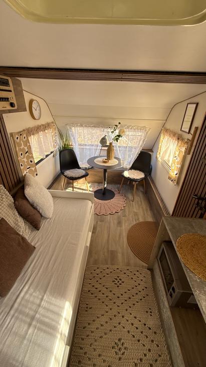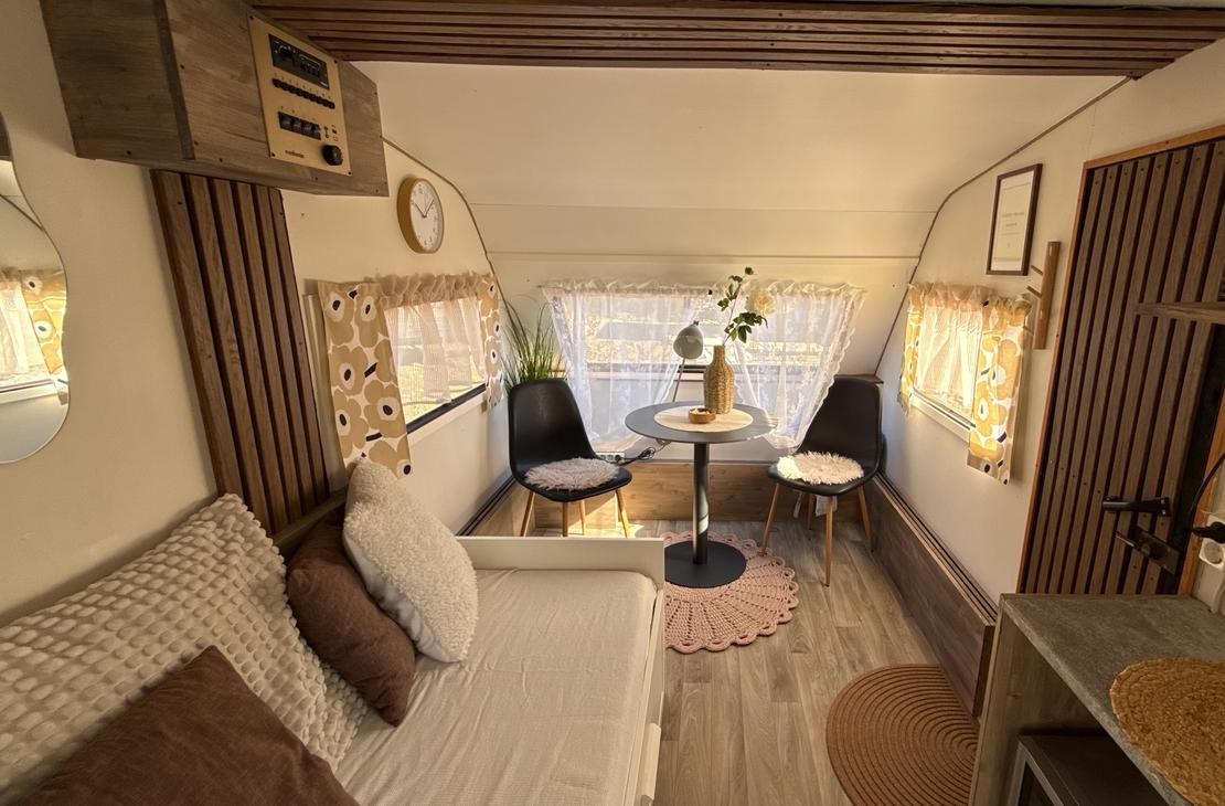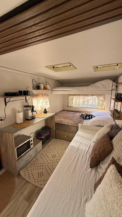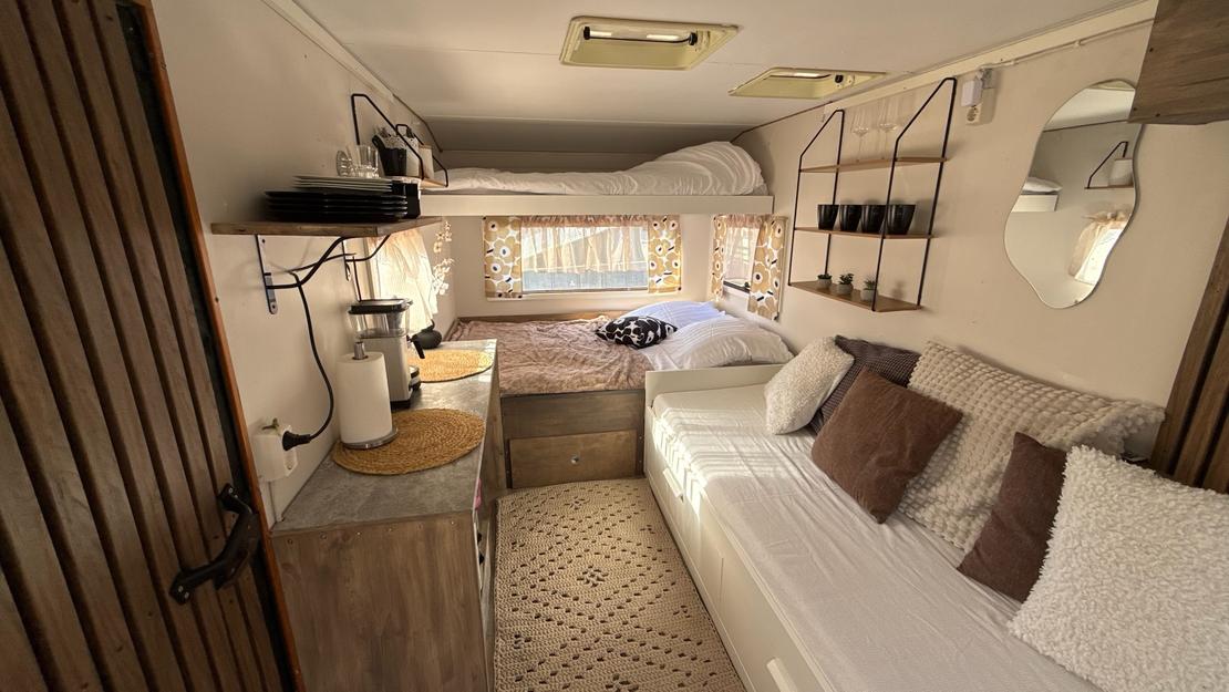 Kotivaunusta löytyy sänkypaikat 4:lle henkilölle, joista yksi sänkypaikka on yläsänky ja sen painoraja on 70kg:a. Kotivaunussa on astioita, mikro, kahvinkeitin sekä pieni jääkaappi.